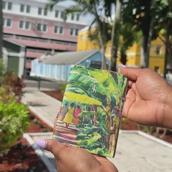 Step into island elegance every time you travel with our Island Stroll Passport Cover, featuring a beautiful illustration of women walking through a tropical town lined with lush banana trees. Crafted from premium PU leather, this passport holder blends luxury, culture, and effortless style for the high-value woman who carries the islands in her heart.